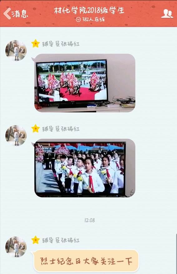今天是2018年9月30日,是我国第五个烈士纪念日。关于烈士纪念日最新资讯成人网 辅导员张瑞红老师利用网络社交平台及时与2018级全体学生分享了中央新闻视频。