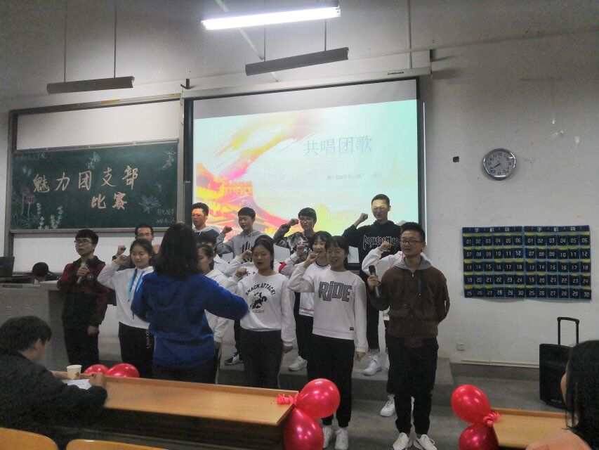 新一届团支书良好的精神面貌。下一项为合唱团歌《光荣啊,中国共青团》,比赛中,各支部都展示了自己的风采,各支部的观众代表为自己的团支部加油打气,现场气氛随着各团支部的精彩演唱迎来一次又一次高潮,听着这慷慨激昂的歌声,更激发了大家对团组织的热爱,坚定了为团组织奉献的决心。最后还进行了抽奖环节,有三位幸运的同学被赠予奖品。评委团对各团支部的表演进行了打分。至此,比赛于9点30分完美谢幕。