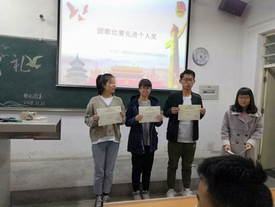团委于2018年11月20日在教三-205举办团歌比赛颁奖典礼。参加本次颁奖典礼的为材料与化工成人网团委副书记甄子清、团委副书记尹相伟、团委全体成员与参与团歌比赛全体人员。