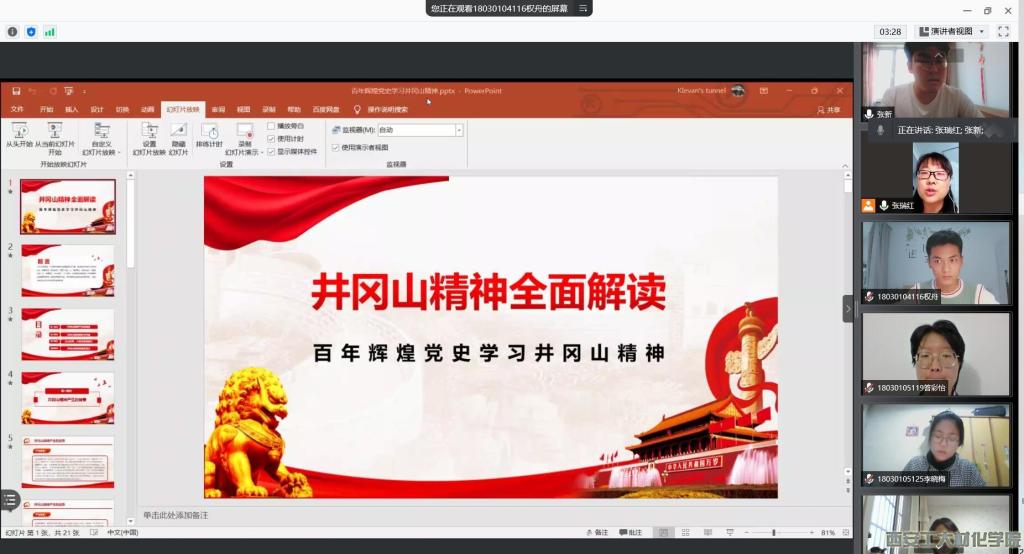 会议伊始,由张瑞红老师对党史学习教育的重要性进行讲解,并以井冈山精神产生的背景;井冈山精神的科学内涵;三大纪律、六项注意的诞生;井冈山精神的现实意义这四个部分对井冈山精神进行了深入讲解。坚定信念、艰苦奋斗、实事求是、敢闯新路、依靠群众、勇于胜利,作为中国共产党在革命斗争的艰苦岁月中形成的伟大精神和马克思主义中国化的理论结晶,井冈山精神集中反映了中国共产党的优良传统和作风,有着极为丰富深邃的精神内涵。而后,由王云霄、张增两位党员同志发表了此次会议学的感悟,至此本次会议圆满结束。